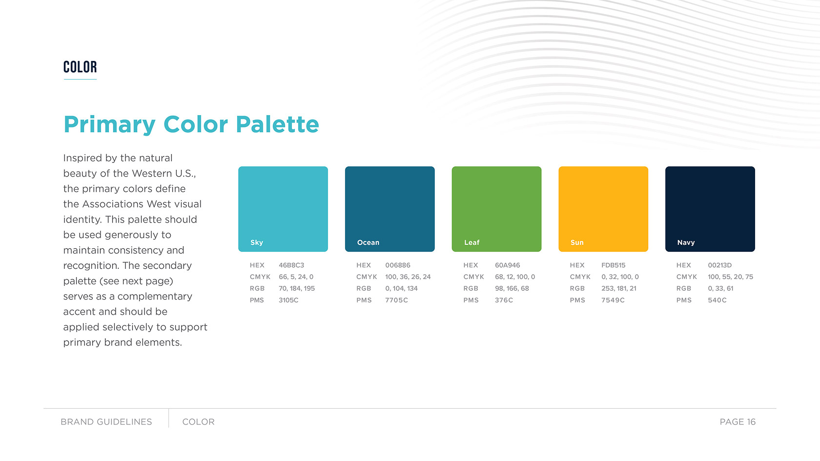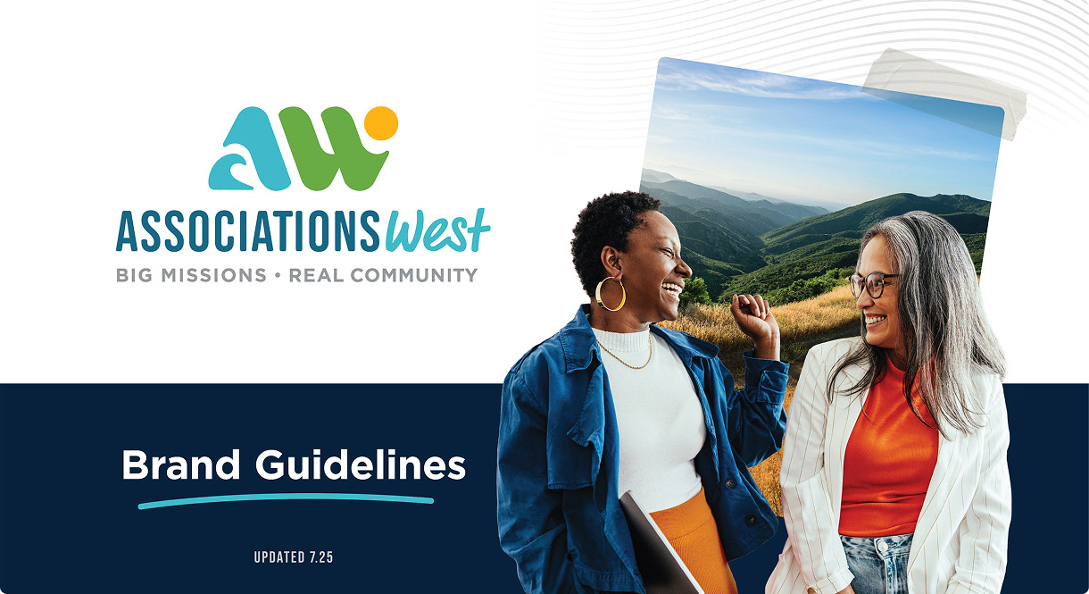Visually, we designed a modern, confident logo that expresses connection and forward movement, supported by a flexible system of typography, color, and graphic elements that can scale from intimate roundtables to large conferences. Paired with practical brand guidelines and communication tools, the new identity equips Associations West to show up consistently, speak with clarity, and confidently connect members.