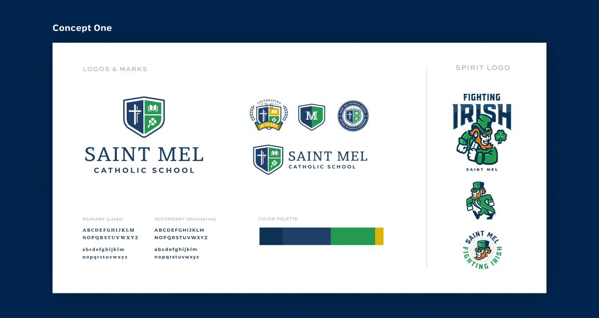 Our team constructed three identity options that ranged from “young and innovative” to “classic and elite.” Once the visual direction was established, we refined a balanced rendition to create a final brand identity that functioned for all of St. Mel School’s intended uses.