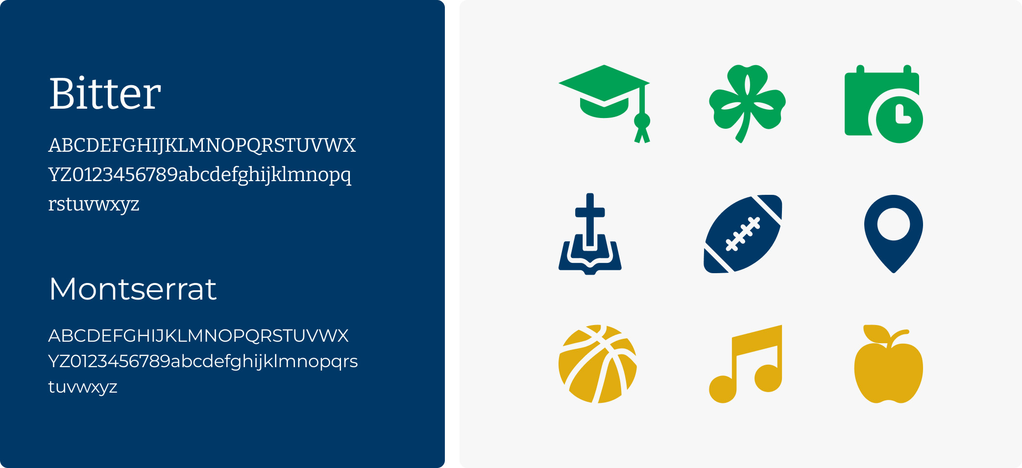 The primary brand palette for St. Mel School consists of a dark blue, vibrant green, and golden yellow. Blue was chosen for the Virgin Mary who is often depicted wearing blue, symbolizing being “full of grace” by divine favor. Green represents the school’s Irish heritage and yellow reflects their ambitions towards excellence and achievement.